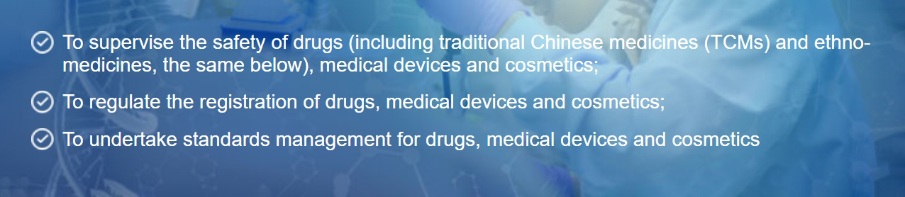 It also oversees the filing of imported Class I devices and the evaluation of registration dossiers for imported Class II and III products on behalf of the NMPA.
